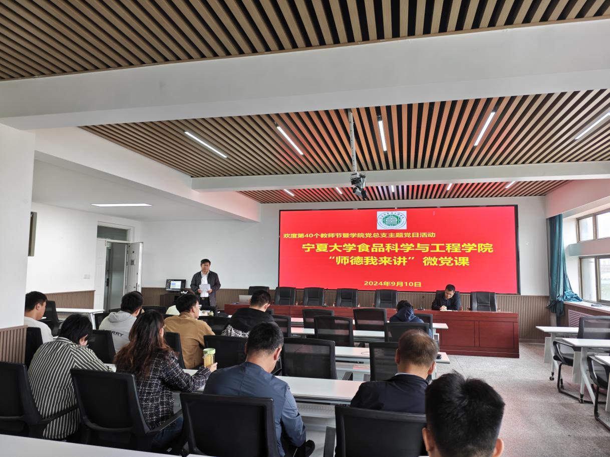 2024年9月10日,在第40个教师节来临之际,学院邀请宁夏大学“立德树人”标兵获得者、宁夏大学首批“百个先锋党小组”负责人范艳丽教授,为广大教师上了一堂“师德我来讲”微党课。范艳丽教授从师德师风的定义、内涵及核心行为要义入手,阐释作为一名高校教师应有的品质素养及高尚道德情操,并结合自己在《食品化学》教学中开展课程育人的具体做法,全方位展示了作为一名优秀教师的仪态举止与仁爱之心,指导广大青年教师更好地展现自己、成就自己,给广大教师带来心灵上净化与升华,激励大家做一名“有温度,有高度、有情怀、有智慧”的好老师。