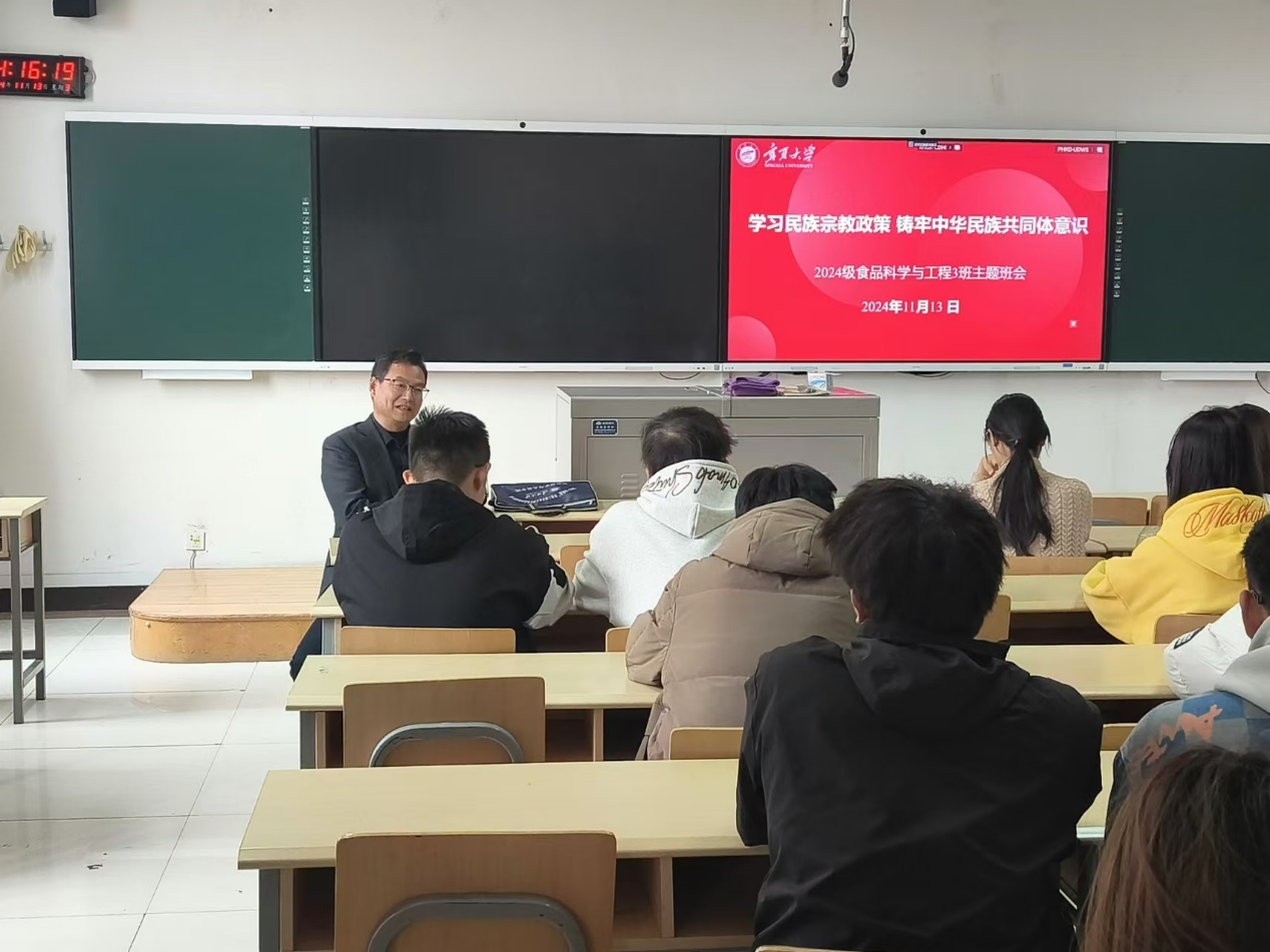 2024级食品科学与工程专业3班主题班会在文萃二教303教室召开。此次班会主题为“学习民族宗教政策,铸牢中华民族共同体意识”,会议由班主任雒雪丽老师主持,学院联系班级领导李文华副书记出席会议并作了宣讲。