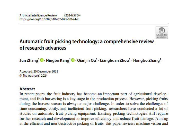 该论文主要阐述了近年来水果产业已成为农业发展的重要组成部分,而果实采收是生产过程中的关键环节,由于采收季的水果采摘始终面临耗时、高成本、低效率的重大挑战。论文以实现果实高效无损采摘为目标,综述了机器视觉与机械式水果采摘技术的研究现状,涵盖当前应用情况、设备结构、工作原理、采摘流程及实验成果,提出了机器视觉与智能化技术是解决枸杞高效无损采摘的关键,算法创新与技术融合将突破当前瓶颈。该研究是宁夏大学在农业机械与计算机科学学科交叉方面取得的重要进展。