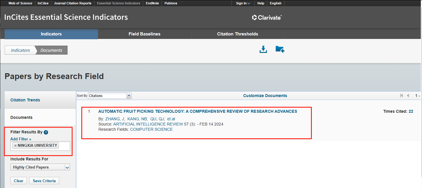 2024届硕士研究生张军(第一作者),指导教师康宁波(通讯作者)在计算机科学-人工智能领域顶级期刊《Artificial Intelligence Review》(JCR Q1,IF=13.9)发表的第一作者单位为宁夏大学的论文“Automatic fruit picking technology: acomprehensive reviewofresearch advances”被遴选为ESI数据库高被引论文,其被引频次已进入计算机科学领域最优秀的1%之列。