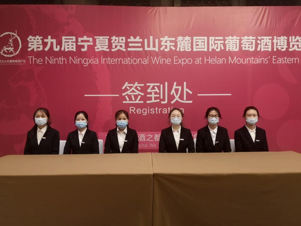 宁夏大学食品与葡萄酒学院志愿者在博览会招待会上提供侍酒服务