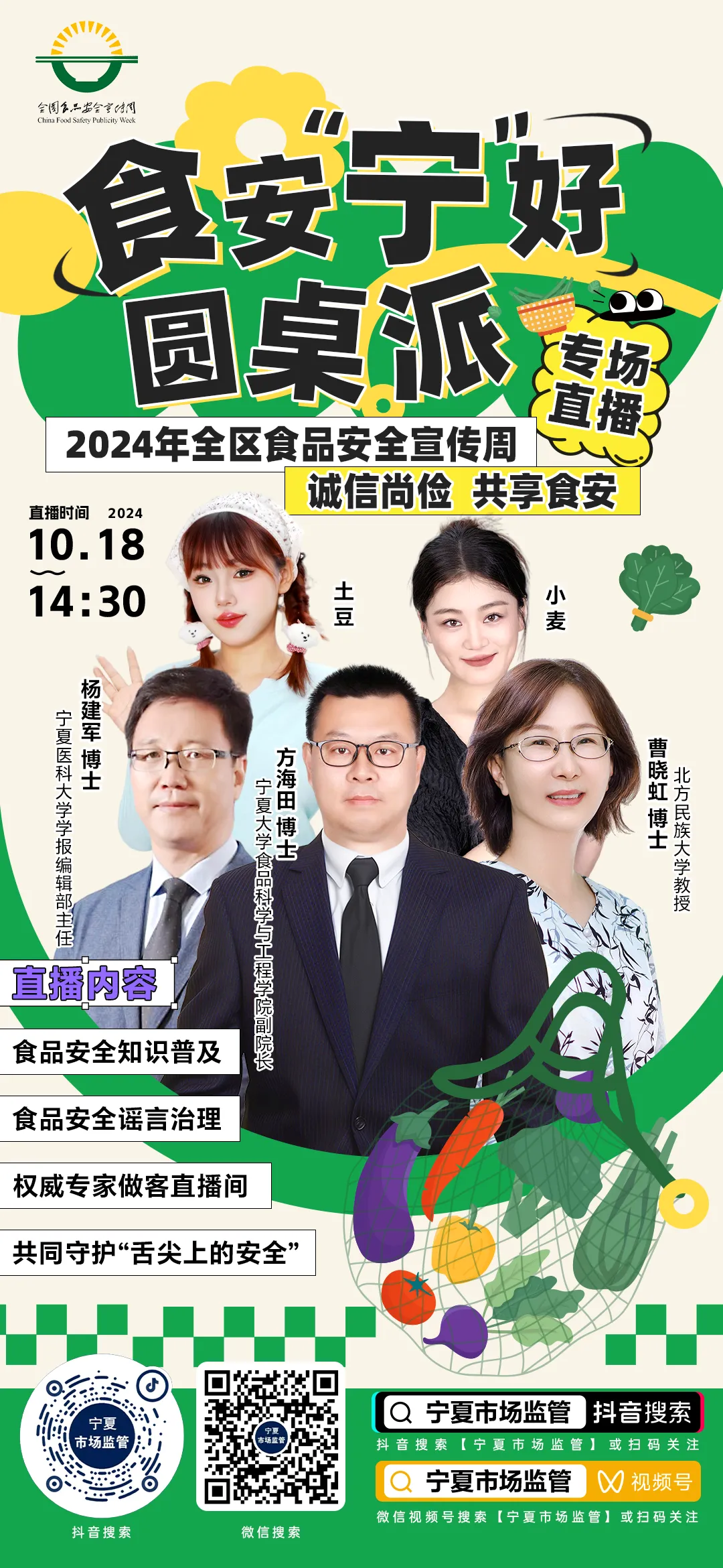 副院长方海田教授应宁夏回族自治区市场监管厅的邀请参加了“食安宁好圆桌派”专场直播活动,活动主题为“诚信尚俭,共享食安”。作为特邀嘉宾,方海田教授与几位食品和营养等方面的专家就当前我国食品安全形势进行了解读,对食品营养与安全科普知识进行了宣讲与互动。