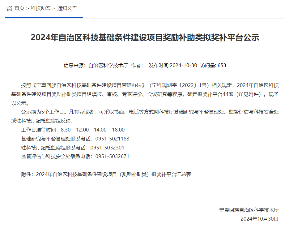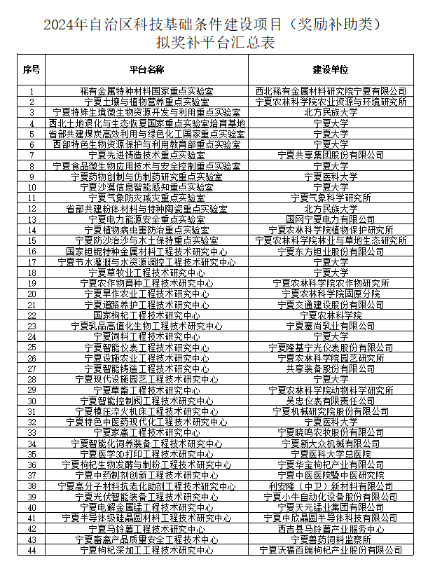 2024 年 10 月 30 日,宁夏回族自治区科学技术厅正式公布了 2024 年自治区科技基础条件建设项目奖励补助类拟奖补平台名单,宁夏食品微生物应用技术与安全控制重点实验室赫然在列。