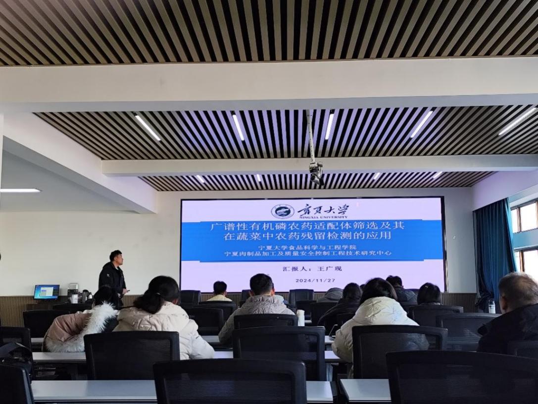 接着,2024 年新入职的崔保中、徐俊南和王广现三位教师分别作题为《内酯豆腐射频杀菌保鲜及杀菌机理研究》《酸土脂环酸芽孢杆菌酸胁迫响应机制研究》和《广谱性有机磷农药适配体筛选及其在蔬菜中农药残留检测的应用》的学术报告。报告结合各自研究方向,展示最新成果与前沿动态,为参会教师提供新的研究视角。崔保中老师介绍内酯豆腐射频杀菌保鲜研究成果,有望延长豆腐保质期;徐俊南老师对酸土脂环酸芽孢杆菌酸胁迫响应机制研究,为果汁防腐提供理论支持;王广现老师关于广谱性有机磷农药适配体筛选研究,有助于提升蔬菜农药残留检测精度。