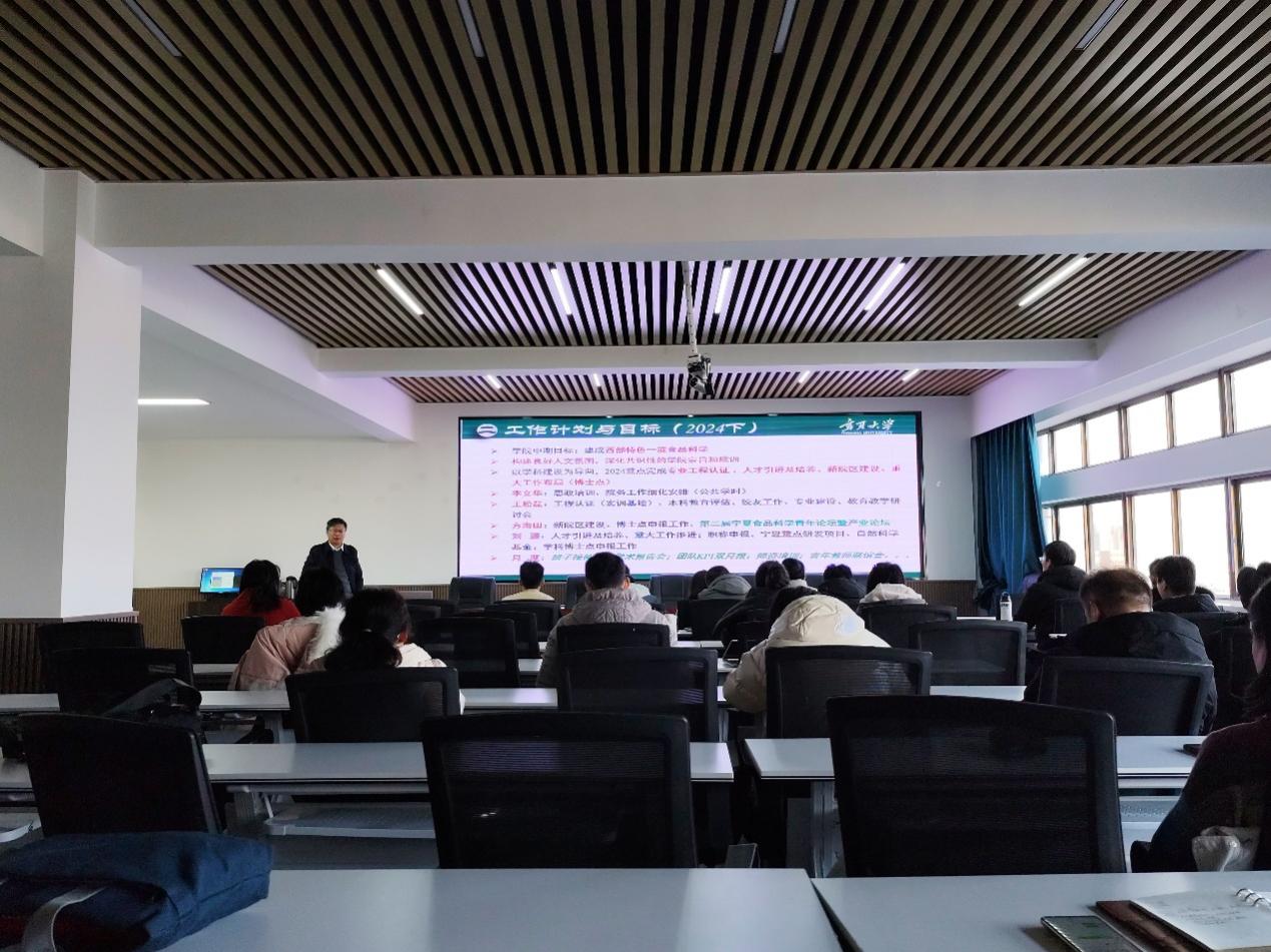 随后,学院领导班子成员就分管工作进行汇报与规划部署。副院长方海田汇报专业硕士学位点评估、博士点申报条件、实验室安全及学位点相关岗位招募聘任等情况,强调要确保学位点评估顺利通过,推进博士点申报工作,保障实验室安全规范运行。副院长王松磊从本科教学评估、枸杞现代产业学院创新项目、教育部本科数据填报、教学计划安排、教改项目申报、通识课建设、本科生班主任工作及社会实践志愿服务等七个方面详细汇报,明确各项工作时间节点与任务要求。院长刘源围绕师资发展、对外交流与科研项目等工作展开汇报,提出学院将加大师资培养力度,拓展对外合作渠道,提升科研创新能力,推动学院高质量发展。